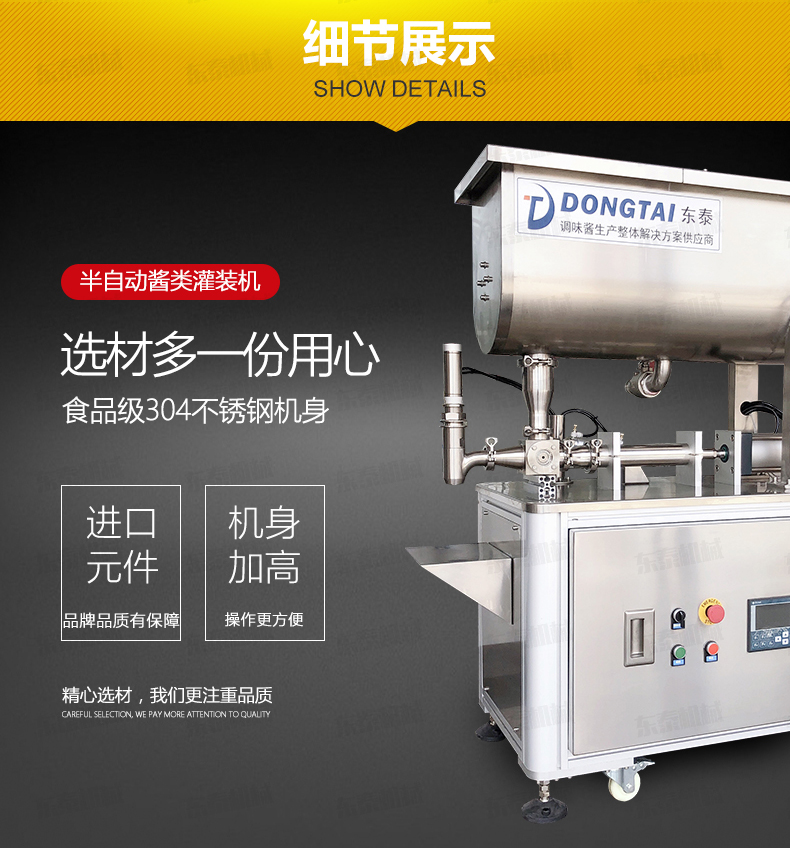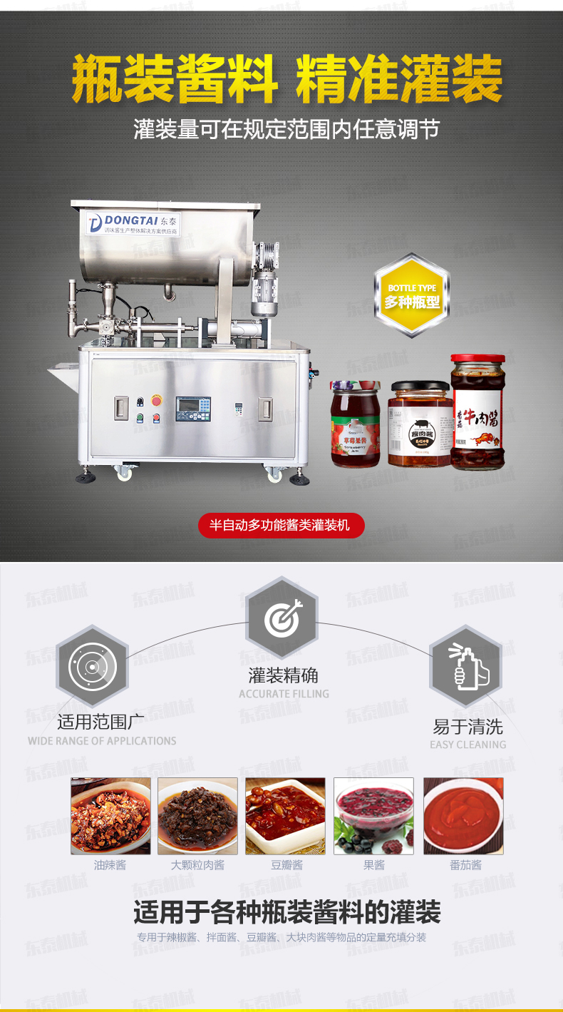 雙頭辣椒醬定量灌裝機(jī)產(chǎn)品介紹: 雙頭辣椒醬定量灌裝機(jī)可自動(dòng)完成計(jì)量、灌裝等全過程,操作方便,灌裝精度高,該機(jī)為 半自動(dòng)灌裝機(jī)械,配置的自動(dòng)攪拌器,保證了醬和油的充分混合,可灌裝顆粒漿狀流體物料在對(duì)