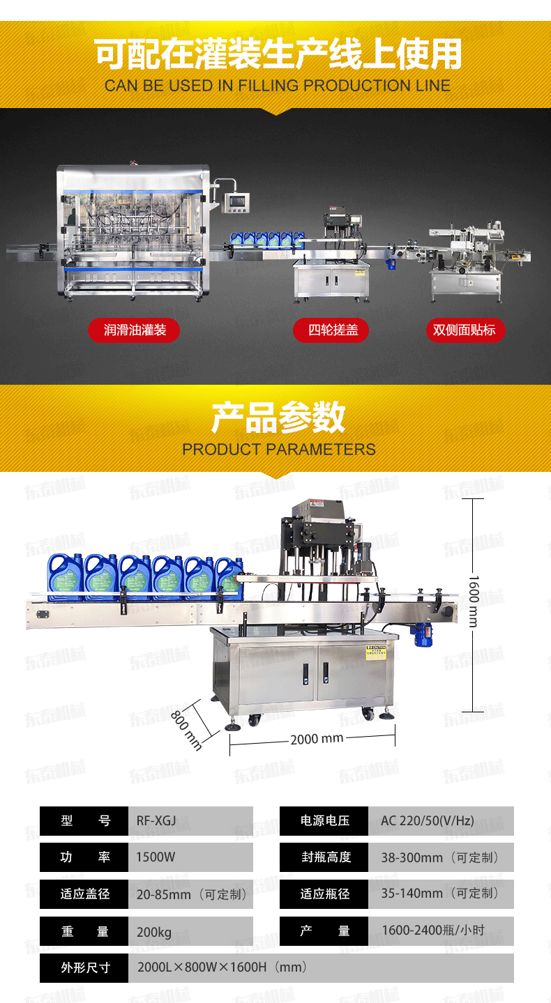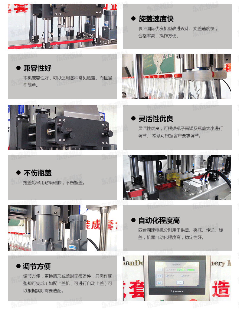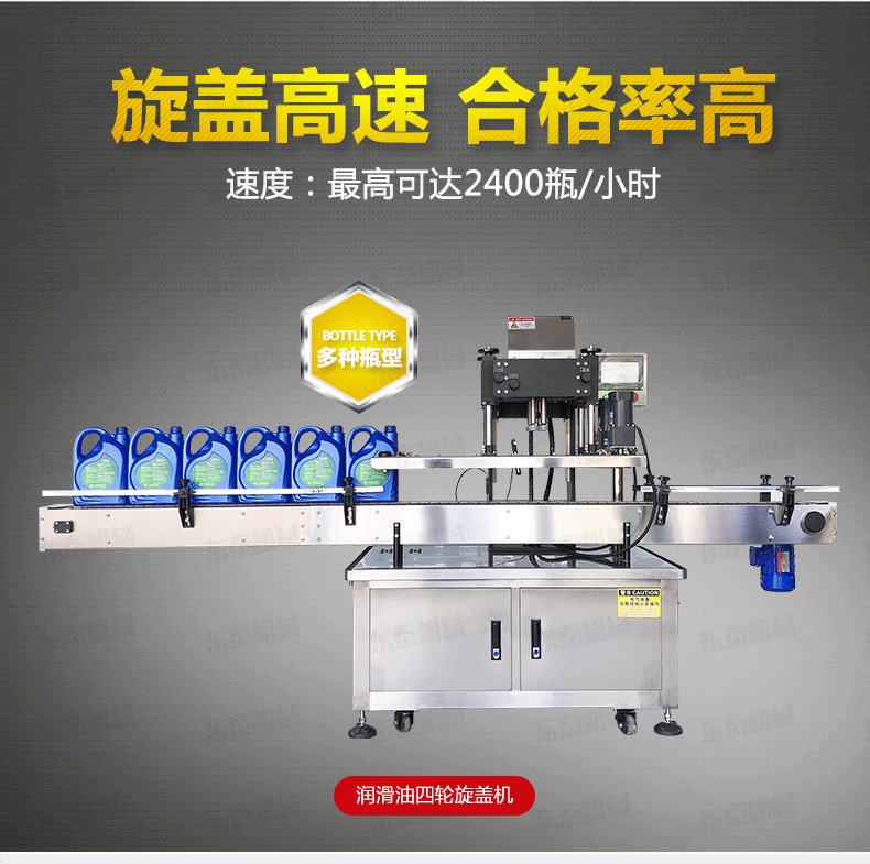 全自動(dòng)旋蓋機(jī)是參照國機(jī)型改進(jìn)設(shè)計(jì)、旋蓋速度快,合格率高、操作方便?蛇m用于食品、制藥、日化、農(nóng)藥、化妝品等行業(yè)的不同瓶形的旋蓋。四臺調(diào)速電機(jī)分別用于供蓋、夾瓶、傳送、旋蓋,機(jī)器自動(dòng)化程度高,穩(wěn)定性好,調(diào)節(jié)方便,更換瓶形或蓋時(shí)無須備件,只需作調(diào)整即可完成(如配上蓋機(jī),可進(jìn)行自動(dòng)上蓋)可以根據(jù)實(shí)際需要選配。