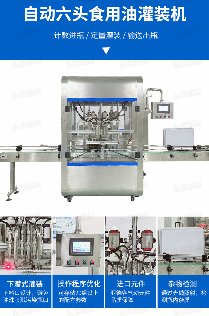 核桃油灌裝旋蓋生產(chǎn)線采用伺服柱塞式計(jì)量灌裝原理,適用于各種規(guī)格(0.1-1升可兼顧到2升灌裝)的南瓜籽油、榛子油、牡丹籽油、芝麻油、核桃油、山茶油、亞麻籽油、棉籽油、橄欖油、大豆油、玉米油、菜籽油
