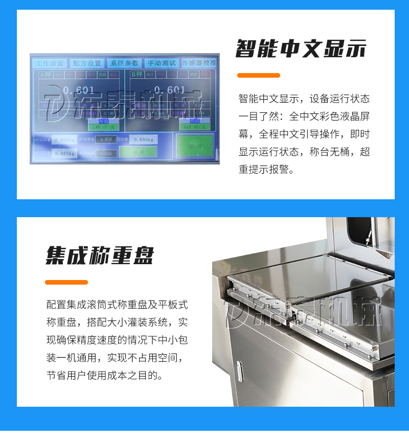 5. 該設(shè)備配備四頭(大小兩組)雙泵,凈重/毛重、自動/手動功能一鍵切換,進一步滿足客戶精度,速度,低投資需求。