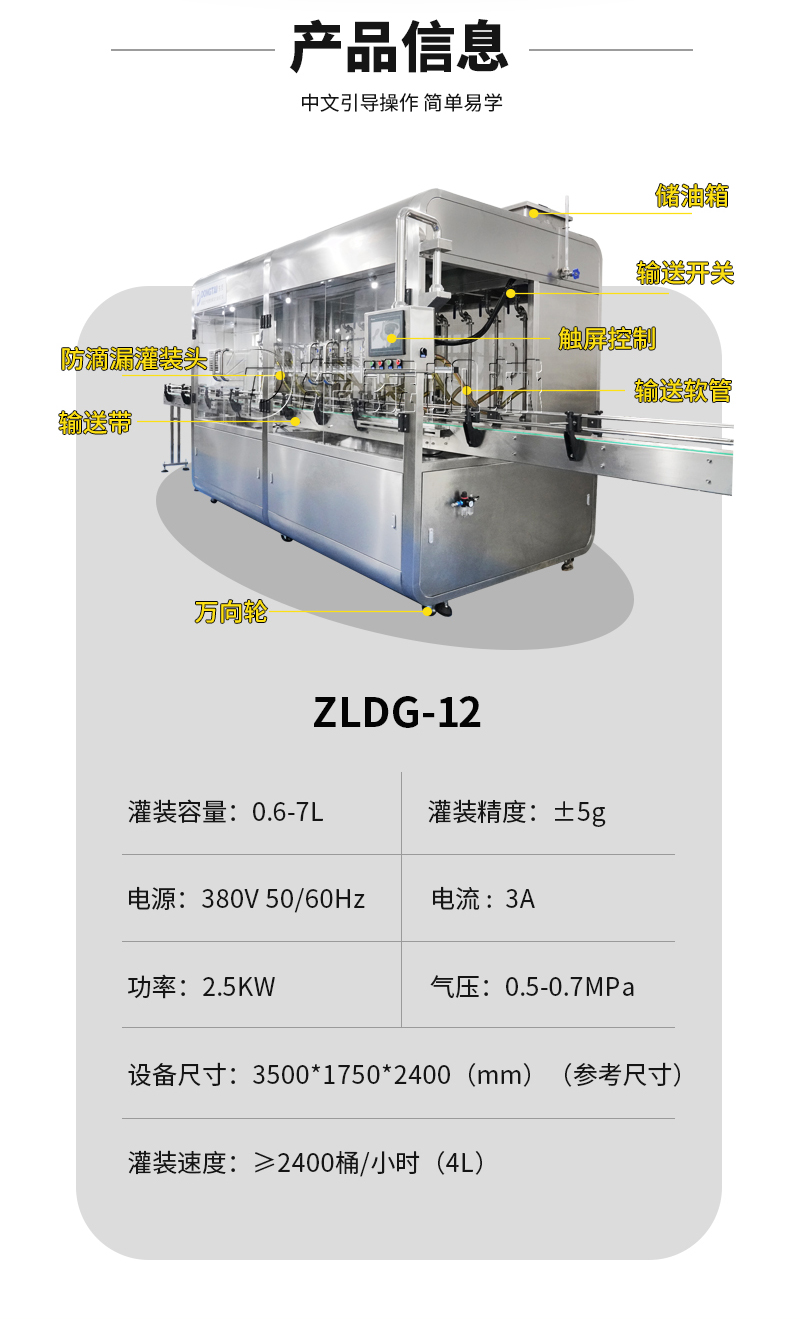 該灌裝機可以配置 高速旋蓋機 油桶貼標(biāo)機 油瓶噴碼機 油壺自動自動裝箱碼垛機。組成油脂灌裝包裝流水線。節(jié)能、自動化的設(shè)備。