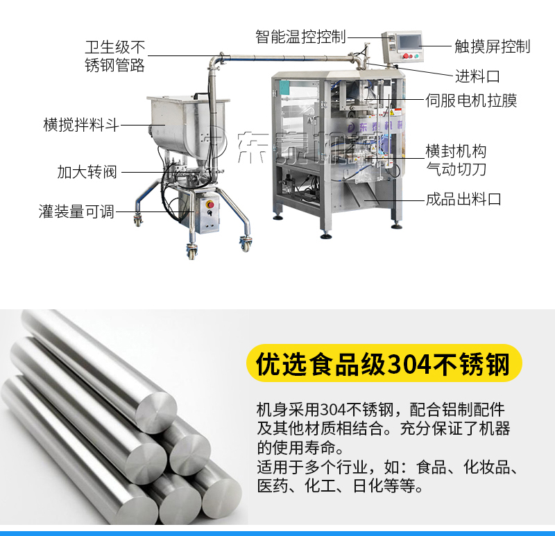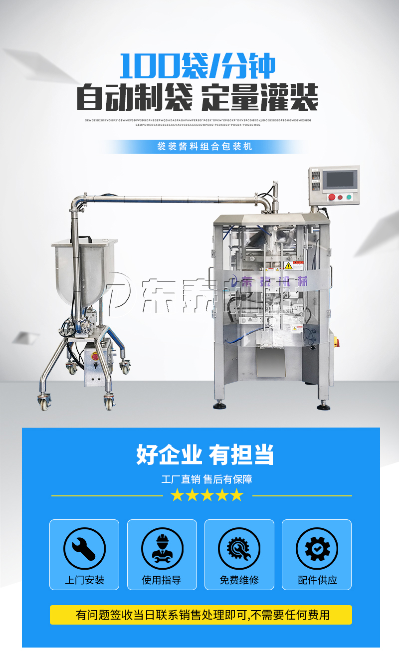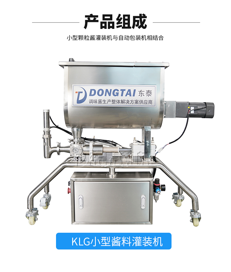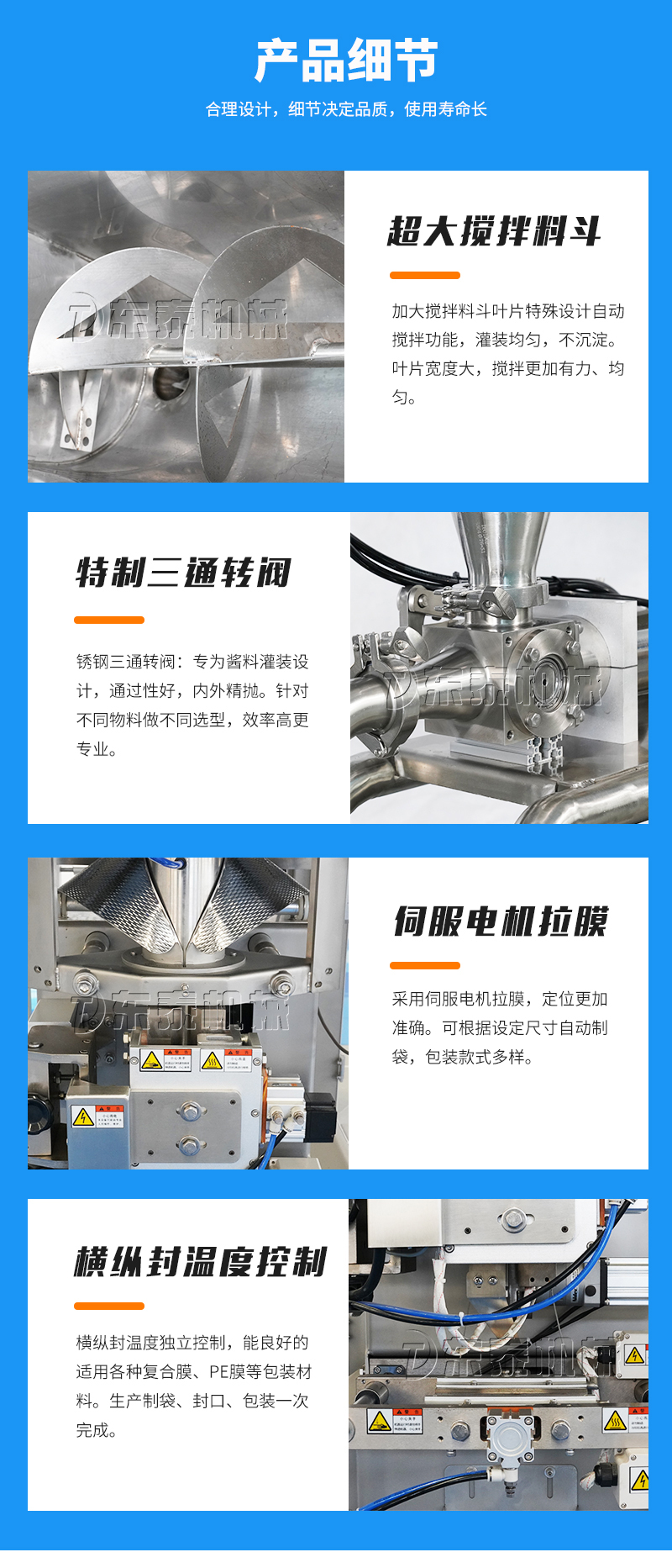 本機器主要用于調(diào)味品醬料的自動化包裝,機器安裝有橫向螺帶式攪拌,使油醬混合均勻,確保灌裝精度和產(chǎn)品包裝成品的均勻性。灌裝計量設(shè)備安裝有萬向輪,管路鏈接均采用快拆接頭,方便灌裝機拆卸移動清洗。包裝設(shè)備采用全伺服驅(qū)動器,包裝速度快,運行穩(wěn)定。