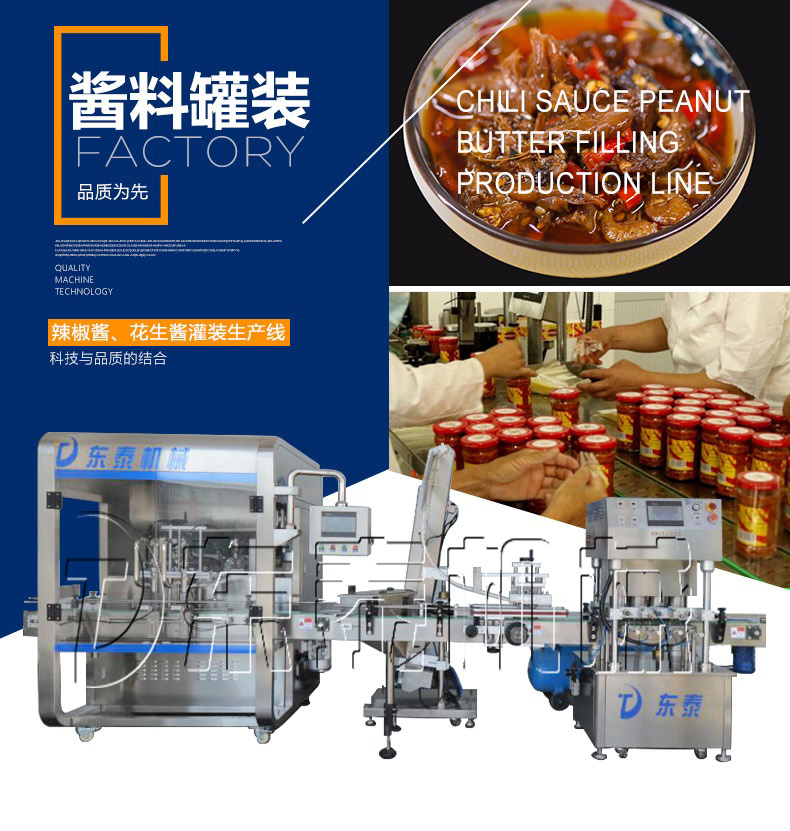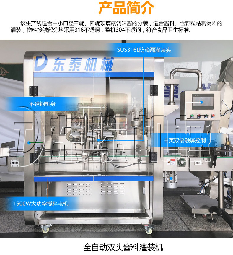 設(shè)備簡介 該生產(chǎn)線適合中小口徑三旋、四旋玻璃瓶調(diào)味醬的分裝,適合醬料、含顆粒黏稠物料的灌裝,物料接觸部分均采用316不銹鋼,整機304不銹鋼,符合食品衛(wèi)生標(biāo)準(zhǔn)。該機設(shè)計合理,機型小巧,立式結(jié)構(gòu),節(jié)省