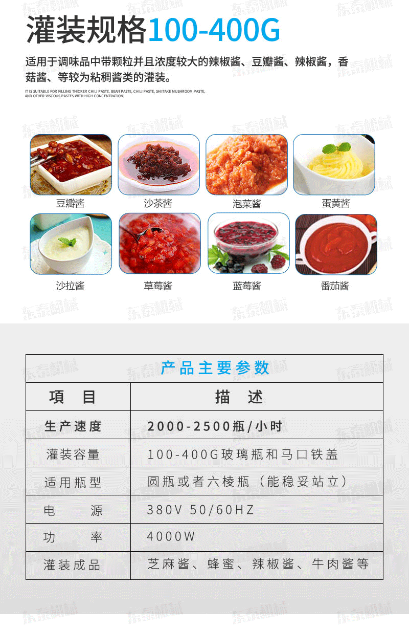 目前我們公司身為國內的辣椒醬灌裝機廠家在國內屬于比較專業(yè)的,辣椒醬灌裝機設備價格不僅是有著優(yōu)勢而且不管是設計理念和外觀模型都已經與國際接軌,可以說正是因為該機的出現才能夠解決了一些醬料廠家遇難的難題和困難,全套辣椒醬灌裝機機械廠家已經是對設備從外觀設計與以往的設計方式完全的不同,變得簡潔大方,并且是我們進行了一些部分附加功能,主要用于一些油料產品的灌裝,能完成自動上料、自動計量、自動灌裝、和自動輸送等功能,可以看到更加的自動化了,因此對于我們這款辣椒醬灌裝機價格可以前來我們東泰公司,將會給你個合理的價格的。