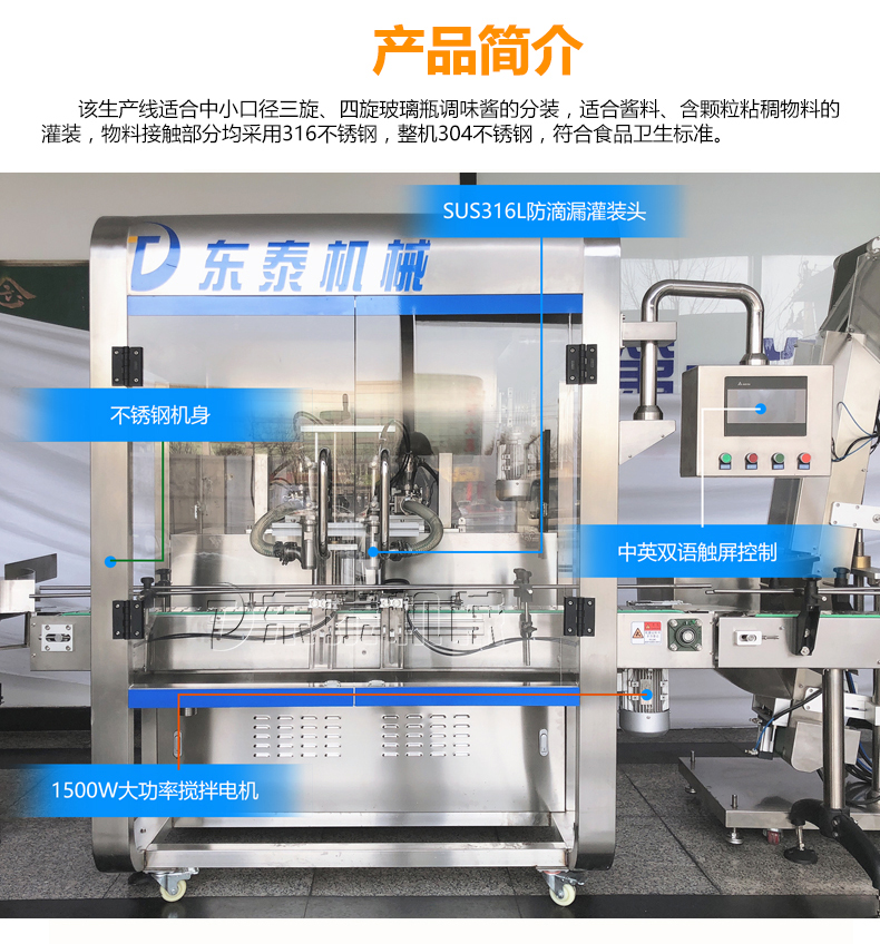 其實對于芝麻醬來說不僅是老北京的喜愛,現(xiàn)在對于一些人來說廚房里邊的芝麻醬一半以上都貢獻給拌面了,另外一半去哪呢?可以用來烙餅,可以用來做菜,可以用來做芝麻醬餅干,甚至湯里邊都要放芝麻醬,其開發(fā)的瓶裝芝麻醬自動灌裝機械、芝麻醬灌裝封口機生產設備讓傳統(tǒng)人工包裝徹底地告別了舞臺,并加快了自己在市場中的步伐,瓶裝芝麻醬自動灌裝機械具有故障率低,維修率低,堅固耐用,灌裝速度快,節(jié)能等特點,出現(xiàn)在了市場之上吸引了一大批的投資客與我們達成了很好的合作。